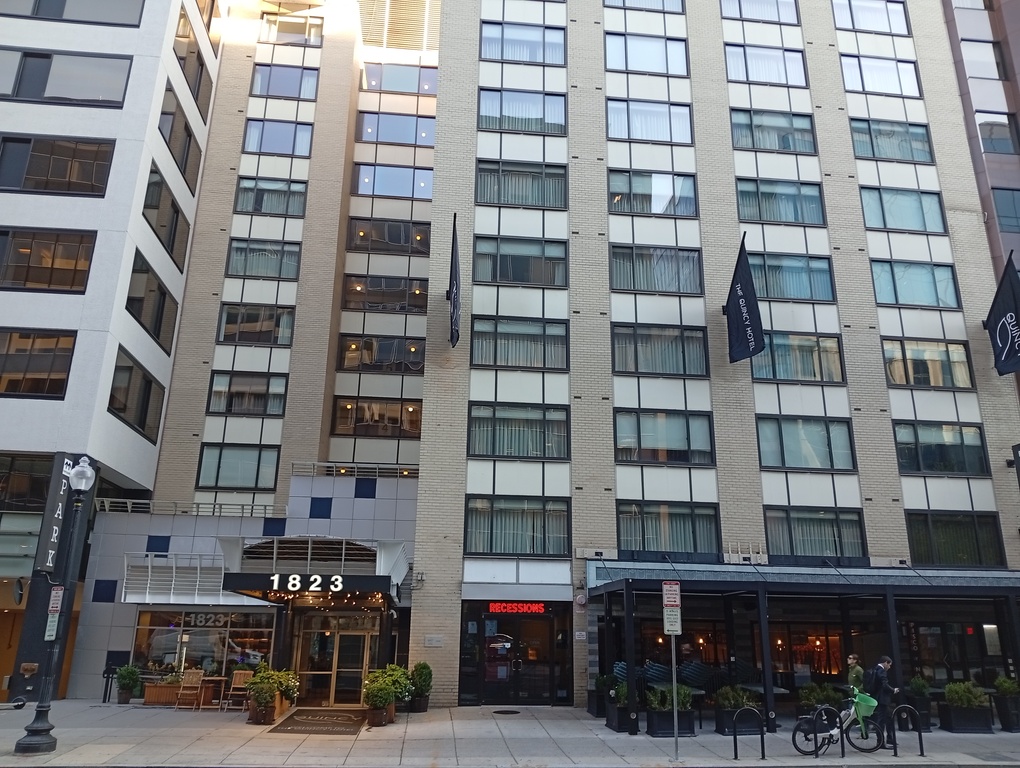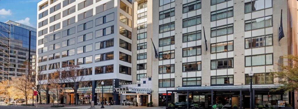 L’hotel sorge al 1823 L Street Northwest, nel quartiere di Washington chiamato Downtown, immerso tra uffici, negozi e ristoranti, a breve distanza da Pennsylvania Avenue, Lafayette Square e da edifici governativi centrali. La sua ubicazione lo rende comodo per muoversi a piedi verso monumenti, musei e aree simboliche della capitale, muovendosi anche con i mezzi pubblici, non solo per la presenza di una fitta rete di autobus veloci, ma anche per la vicinanza di due stazioni di metropolitana, di cui una (Farragut West) ha il pregio di portare direttamente senza cambi all’aeroporto Dulles International, dove arrivano i voli dall’Europa. Nei fine settimana la tariffa di questa corsa in metropolitana, che dura poco meno di un’ora per ché l’aeroporto è lontano e si trova in Virginia, è incredibilmente bassa, solo 2 dollari e mezzo.