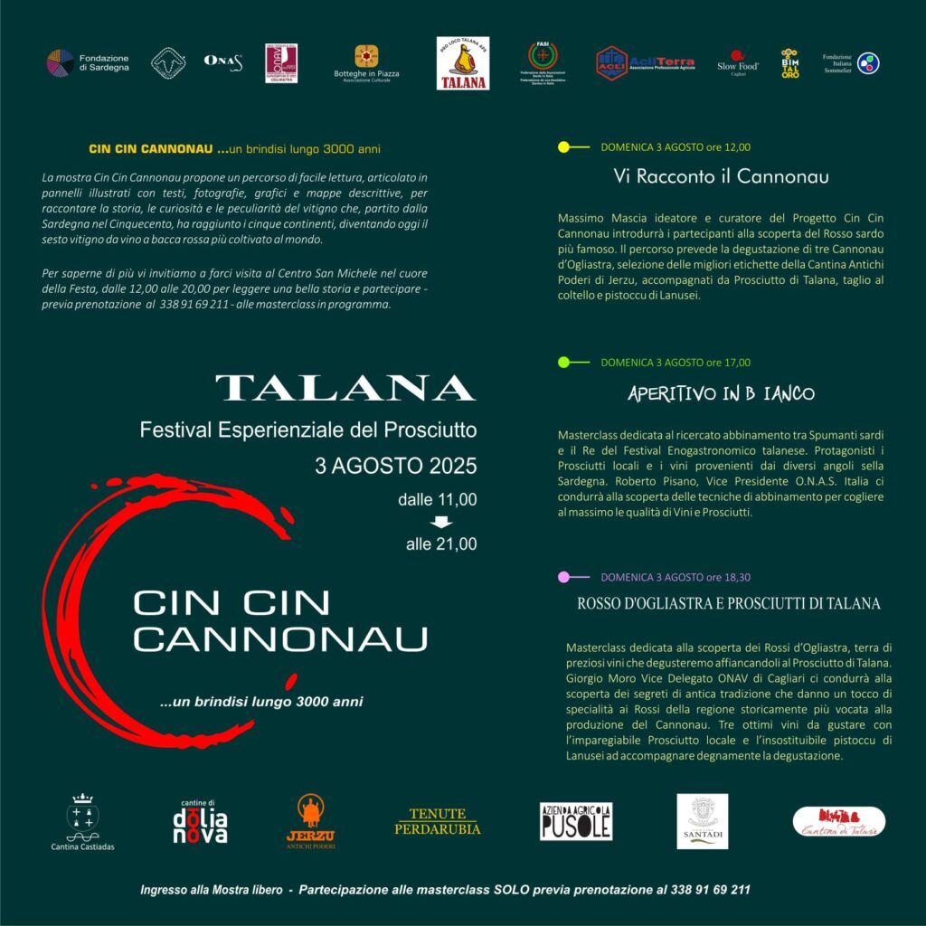 Domenica 3 agosto 2025 Cin Cin Cannonau sarà ospite del Festival Esperienziale del Prosciutto di Talana, con uno spazio dedicato all’esposizione dei 20 pannelli che raccontano e descrivono il Cannonau e tre masterclass di abbinamento tra vini e il re dei salumi isolani: sua maestà il Prosciutto di Talana. Tre appuntamenti da non perdere si susseguiranno dalla tarda mattinata alla sera.