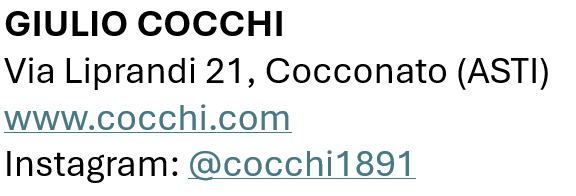 Dal fondatore Giulio Cocchi la casa vinicola ha ereditato un’inesauribile vivacità e una ricerca qualitativa che la porta a essere conosciuta e apprezzata in cinque continenti. A definire lo stile Cocchi sono quindi eleganza e autenticità: la qualità del vino, la maestria e l’esperienza tecnica più che centenaria e una passione e una creatività mai venute meno negli anni.