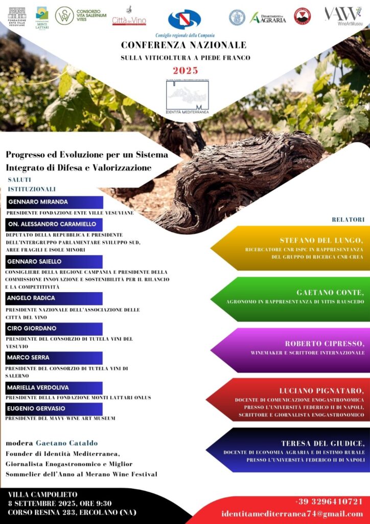 Il giorno 8 settembre 2025, dalle ore 9:30 alle 13:00, presso Villa Campolieto in Corso Resina n. 283 a Ercolano (Na), l’Associazione Culturale Identità Mediterranea ha organizzato una Conferenza Nazionale sulla Viticoltura a Piede Franco con il Patrocinio Morale del Consiglio Regionale della Campania, del Dipartimento di Agraria dell’Università Federico II di Napoli, dell’Associazione Nazionale delle Città del Vino, del Consorzio di Tutela dei Vini del Vesuvio, del Consorzio di Tutela dei Vini di Salerno, della Fondazione Monti Lattari Onlus, Fondazione Ente Ville Vesuviane e del Mavv-Wine Art Museum.