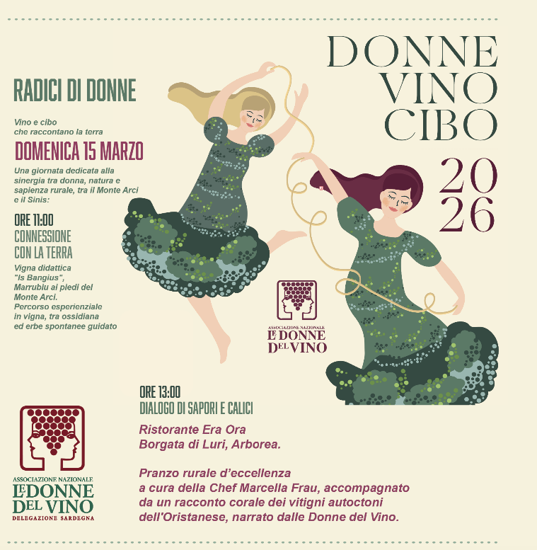 Oristano 16/03/2026 – Si è svolto tra Monte Arci e Sinis l’appuntamento delle Donne del Vino Sardegna dedicato al tema 2026 dell’associazione, “Cibo, Donne e Vino”, declinato per questa occasione nel segno delle radici: quelle della terra, della vite e delle donne che lavorano nella filiera vitivinicola.