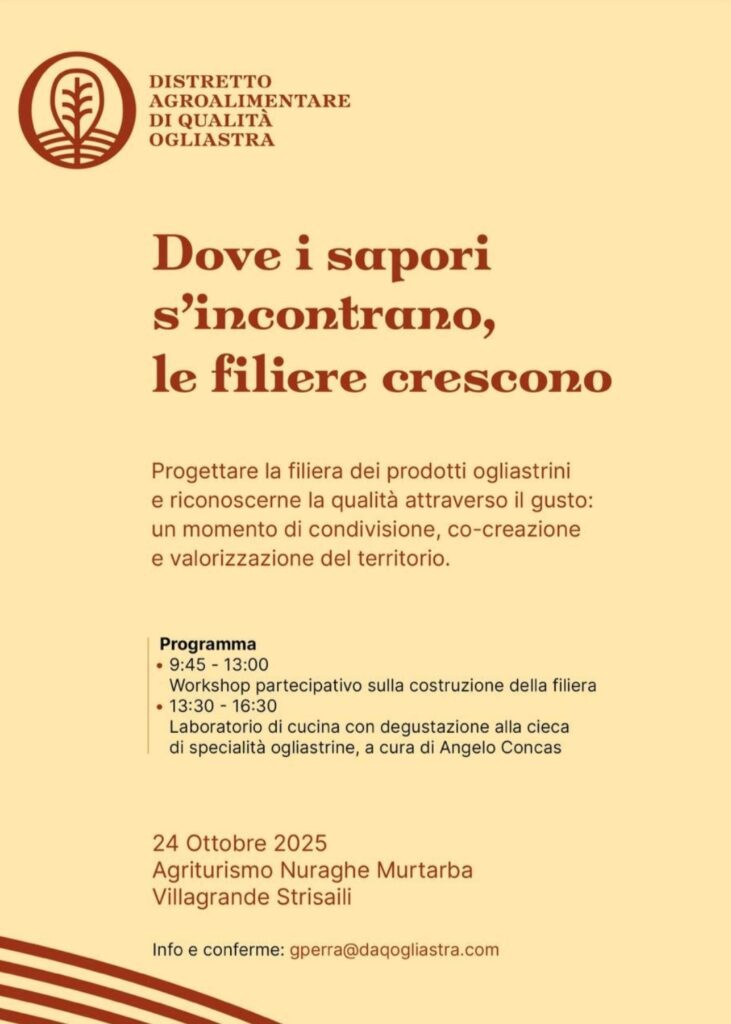 La mattina sarà dedicata a un workshop partecipativo: un momento di confronto e co-creazione per immaginare insieme la filiera dei prodotti ogliastrini, dal campo alla tavola, e rafforzarne il valore condiviso.