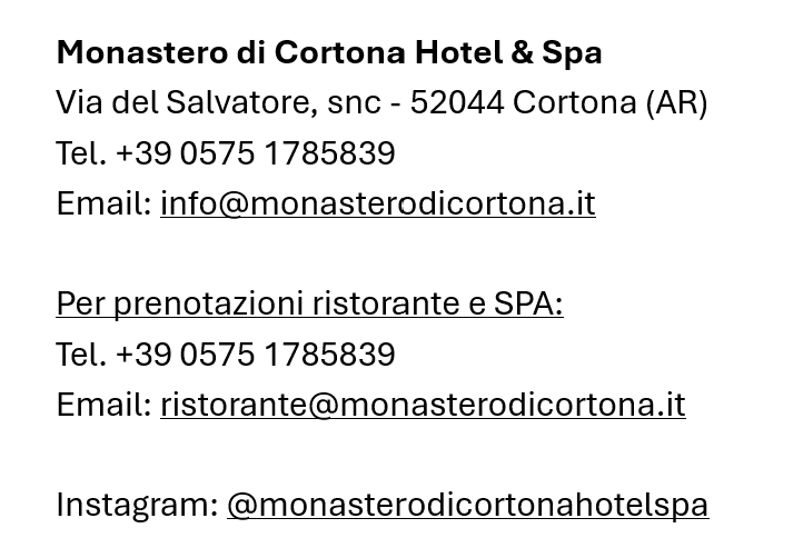 Immaginate di camminare tra le viuzze di un borgo toscano, con il profumo del pane appena sfornato nell’aria, le colline che sembrano dipinte e il suono delle cicale che accompagna ogni passo.Un antico convento del ‘400 e vi catapulterà in un luogo dove il tempo sembra essersi fermato. Benvenuti al Monastero di Cortona Hotel & Spa, cinque stelle di pura bellezza nel cuore della Toscana.