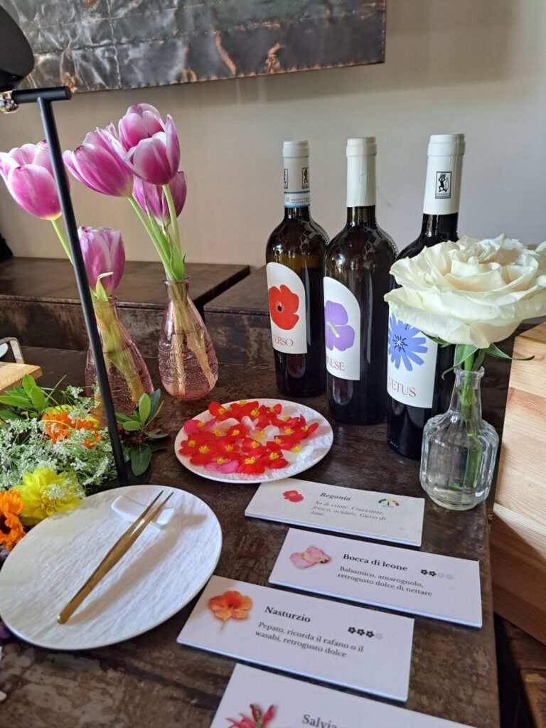 L’esperienza è un crescendo sensoriale. Si parte da fiori più delicati—come la Dalia, leggermente erbacea e amara, simile al profilo di un carciofo crudo—e si sale di intensità con la Begonia, croccante e agrumata, con retrogusto di melograno. Poi è il turno della Bocca di leone, dal sapore balsamico e con un tocco dolce dato dal nettare nascosto al suo interno, seguita dal sorprendente Nasturzio: deciso, pepato e piccante, con note che ricordano il wasabi e un retrogusto che arriva in ritardo.