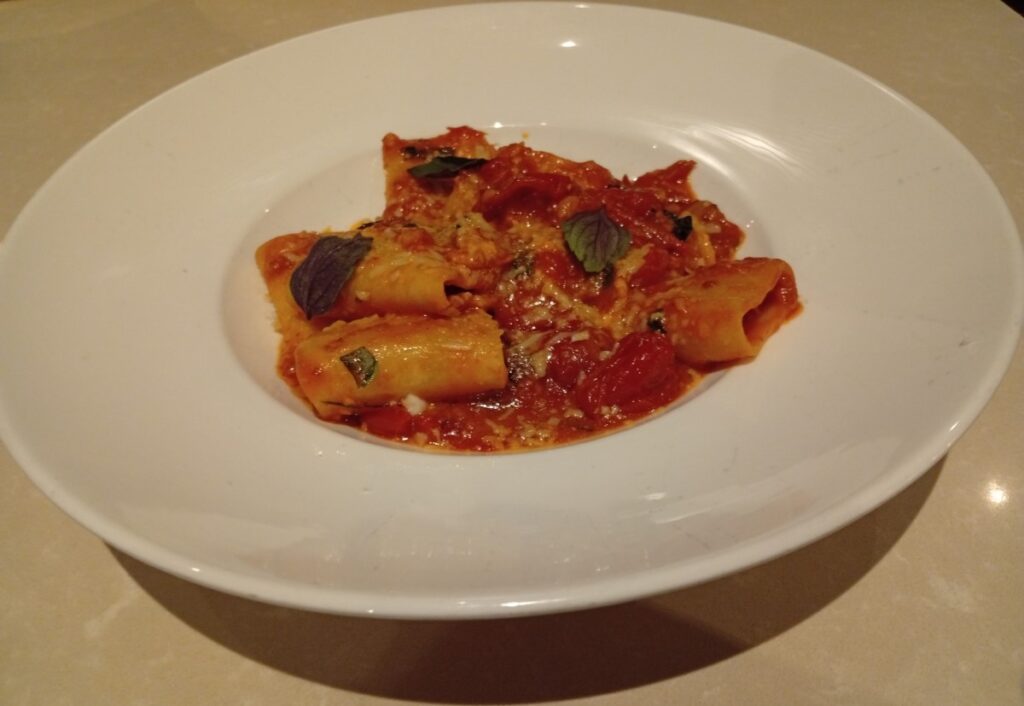 La scelta tra i primi piatti di pasta all’italiana propone dei saporiti paccheri alla Norma con melanzane arrostite, mozzarella, parmigiano e basilico e un’originale trovata dello chef de cuisine James Robinson, i ravioli doppi di barbabietola con crescione, nocciole e burro bruno al vino Marsala, inconsueti e assai delicati.