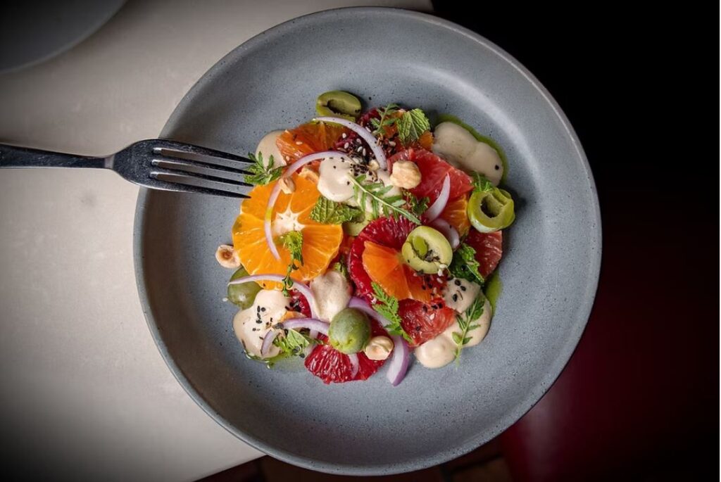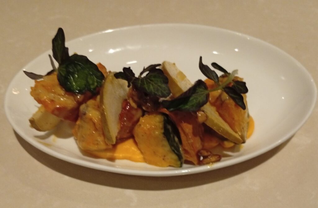 Tra le meze viene servita la focaccia del giorno con uva arrostita, olive kalamata e salvia fritta, le ostriche della baia di Chesapeake alla griglia con ‘nduja calabrese, burro al latte di capra e scalogno caramellato, il cavolo romano grigliato con chicchi di melagrana, erbe fresche, mandorle e salsa al limone, l’insalata di zucca locale accompagnata da una delicata mousse di miele, semi di pera speziati e crescione e il crudo di snapper, un pesce bianco americano, con purea di cetriolo, coulis di peperone rosso e miso wasabi.
