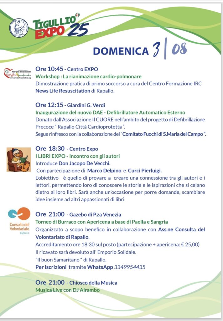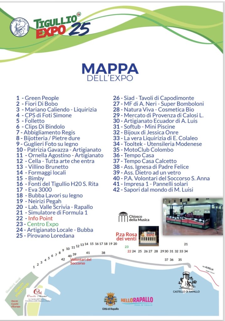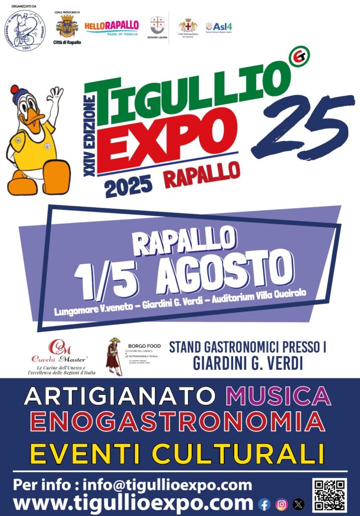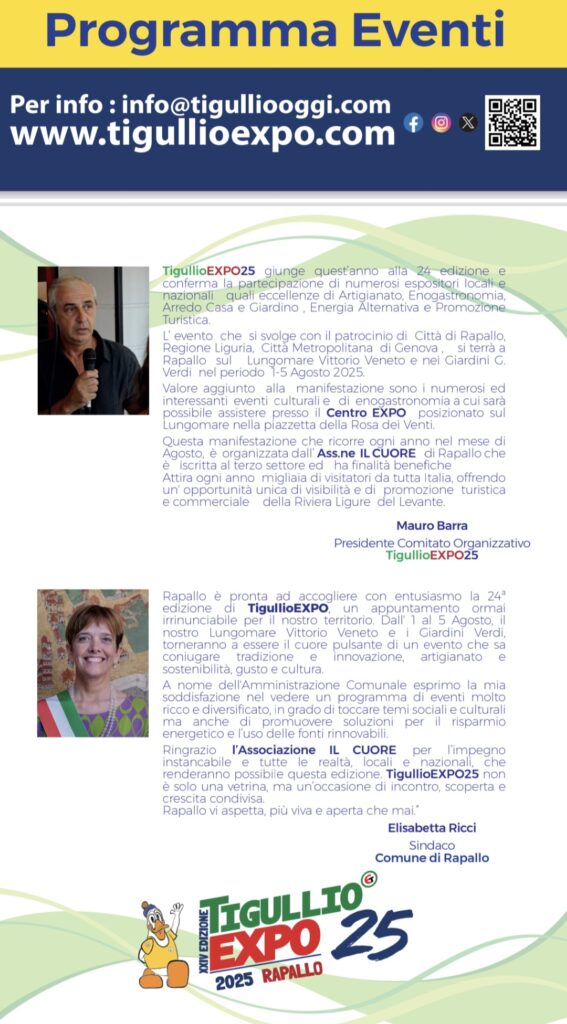 Rapallo, XX luglio 2025 – Anche quest’anno l’Associazione IL CUORE presenta la 24ª edizione del celebre TigullioEXPO, un evento che da sempre valorizza artigianato, enogastronomia, energia alternativa, arredo casa e giardino, e promozione turistica, con la partecipazione di espositori locali e nazionali.