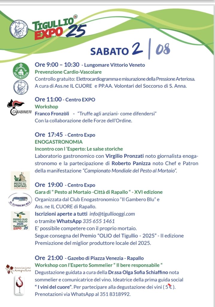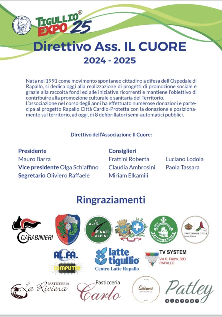 Il presidente dell’Associazione IL CUORE, Dott. Mauro Barra, dichiara: “TigullioEXPO25 conferma la partecipazione di eccellenze locali e nazionali in un’atmosfera all’insegna della cultura, del gusto e dell’innovazione”