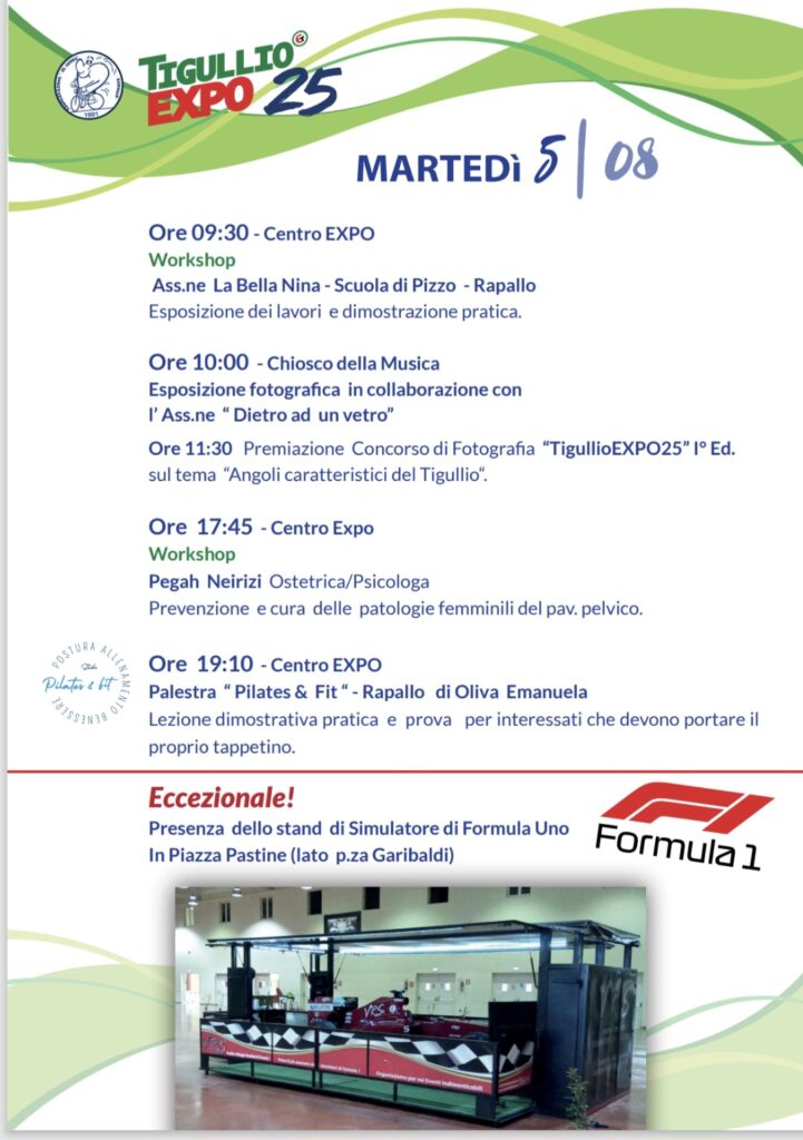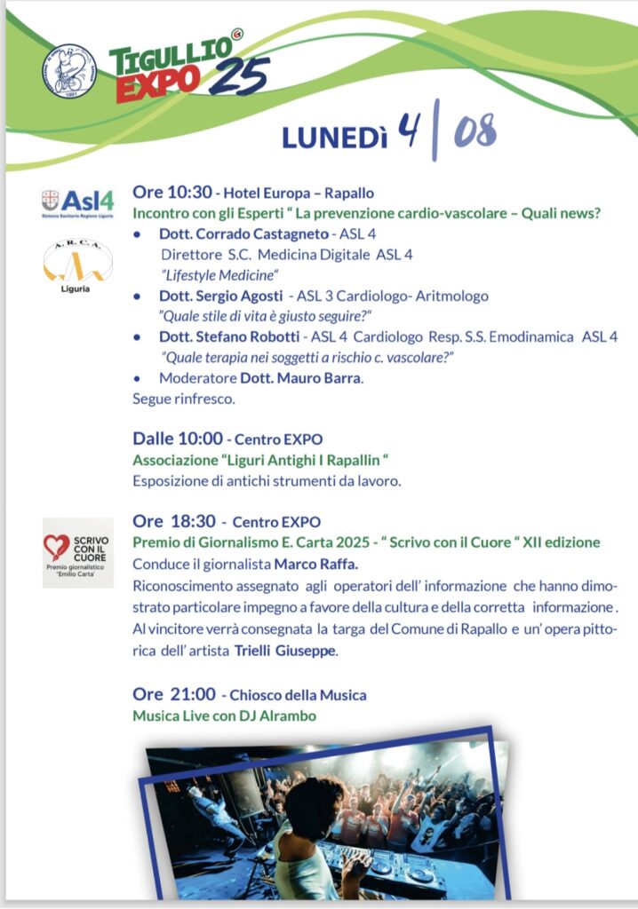 • Premi e momenti culturali, tra cui Premio Giornalismo “Emilio Carta” (4 agosto) e il concorso fotografico “TigullioEXPO25” (5 agosto);