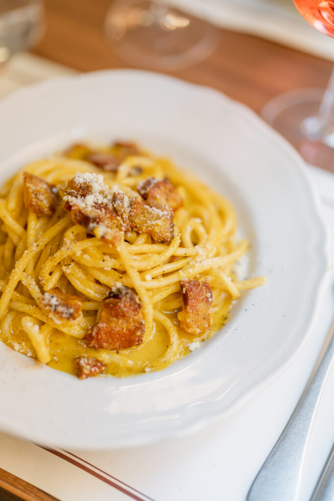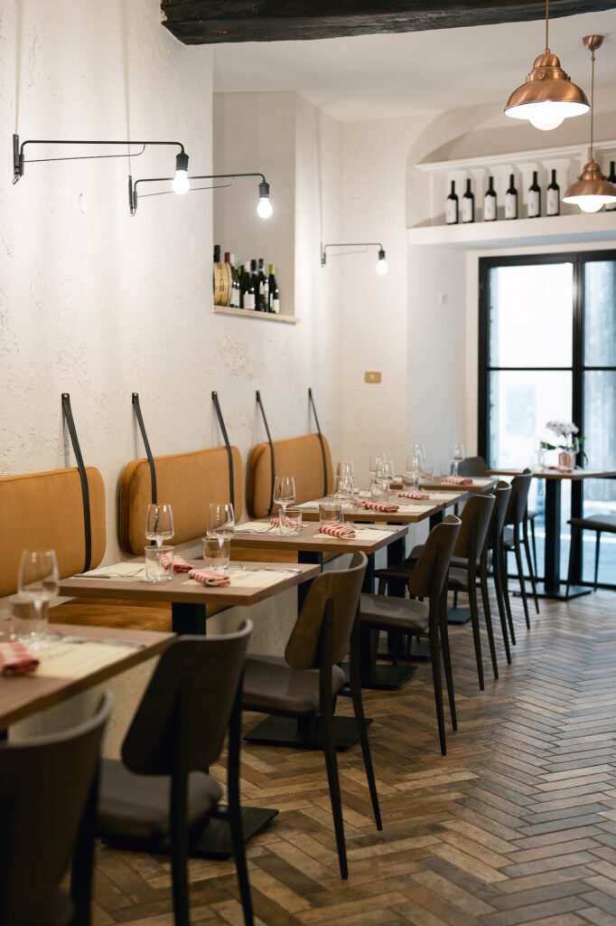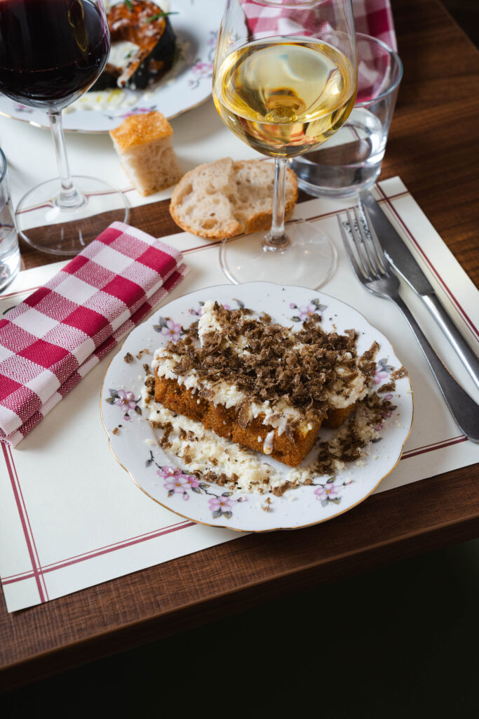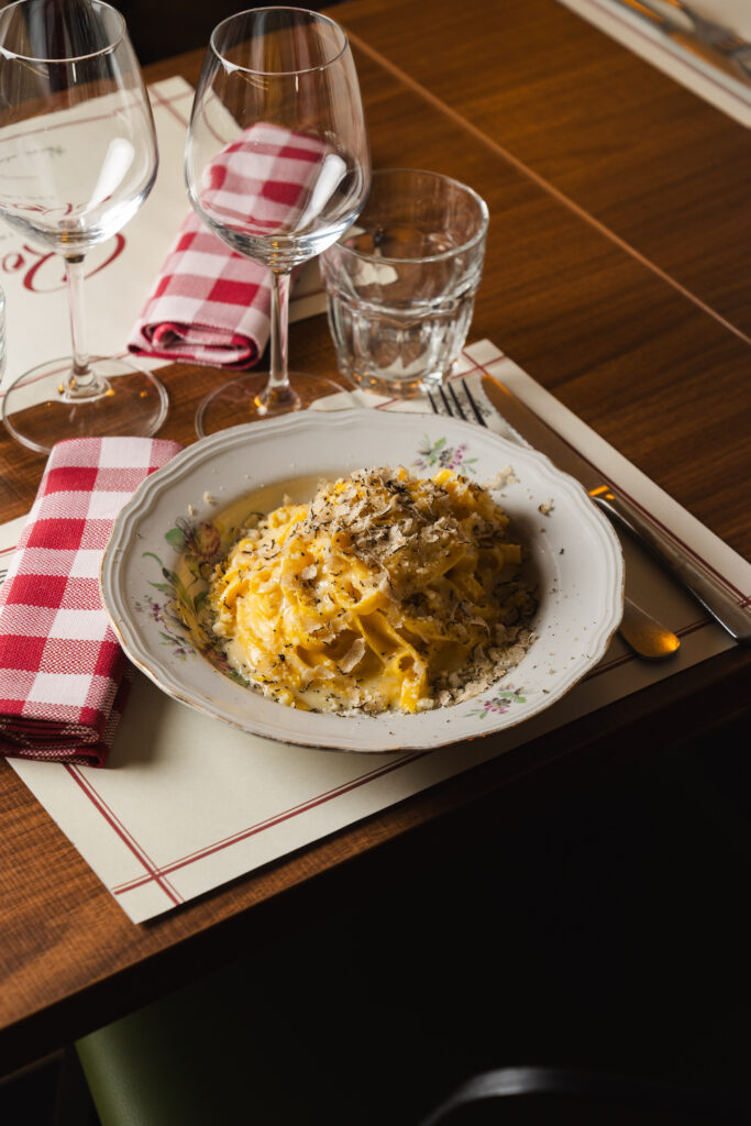 Il menu cambia ogni 3-4 mesi, seguendo stagionalità e ispirazione. Ma ci sono dei classici che non si toccano: la polpetta di genovese, con più cipolla che carne e una fonduta di pecorino da applausi; la pizzetta con lingua di manzo e maionese alla senape; i ravioli di Rosina, con ricotta, spinaci, sugo di datterini e zest di limone. E ancora, l’orecchia d’elefante (una cotoletta degna di Milano), il risotto osso buco e zafferano che va a ruba anche in piena estate e le fettuccine “alla cornuta”, piatto ironico e saporito a base di burro, parmigiano e tartufo.