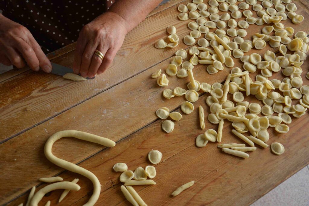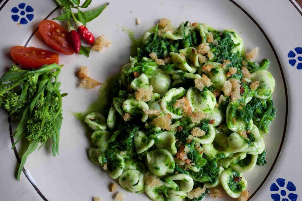 Orecchiette con pesto di pomodoro ed erbette aromatiche tipico di Pantelleria, con pesto di pala di fico d’India, con spigola del Mediterraneo, con cozze, con salsiccia di suino nero pugliese, con cipolla rossa di Acquaviva. E ancora, con caciocavallo Podolico del Gargano e con ricotta di capra jonica.