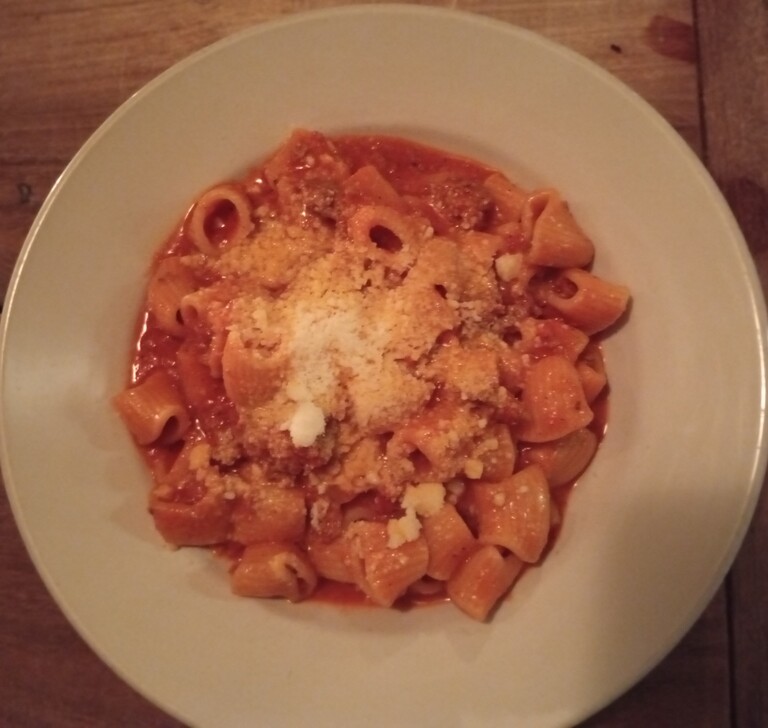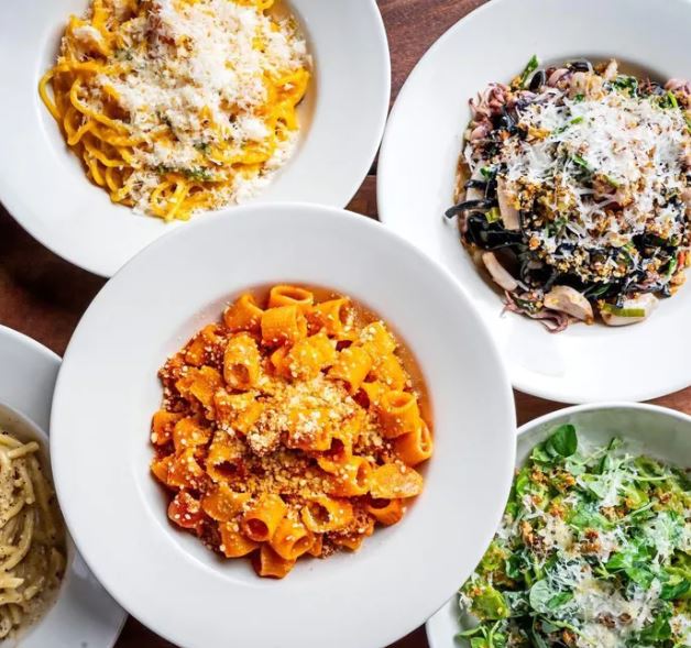 Oltre alle focacce, agli antipasti e a un’ampia selezione di abbondanti primi piatti di pasta, che in America sono spesso visti come piatto principale, un esempio di piatti di carne sono il mezzo pollo biologico arrosto in padella con limone, verdure autunnali, sottaceti ed erbe fresche oppure la milanese croccante di maiale accompagnata da cavolo rosso brasato, pancetta e crema di senape.